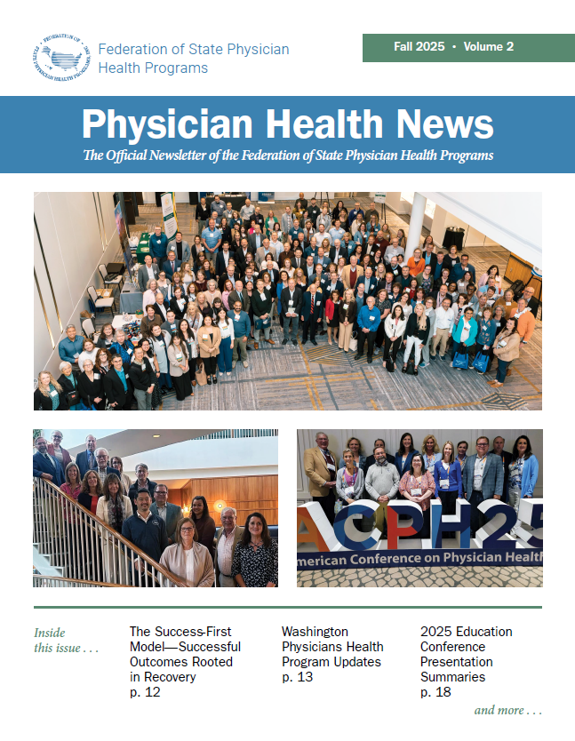 Welcome to Physician Health News, the official newsletter of the Federation of State Physician Health Programs (FSPHP). The newsletter is published by the FSPHP, with production and printing assistance from the Massachusetts Medical Society.